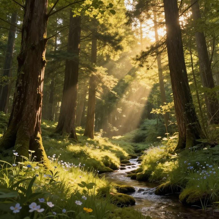 A tranquil forest clearing bathed in golden sunlight with sunbeams filtering through tall ancient trees. The forest floor is covered with lush green grass and scattered wildflowers. A small, gentle stream winds through moss-covered rocks, creating a soothing and peaceful natural scene.