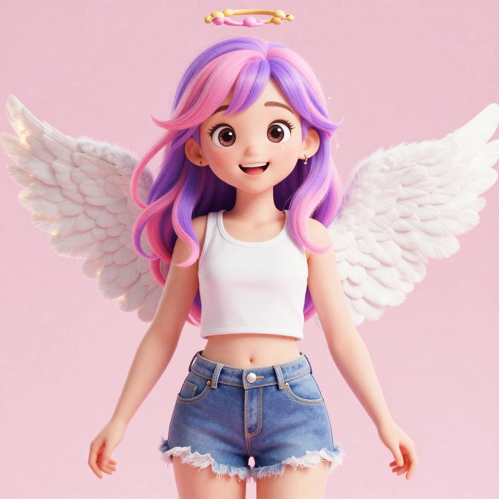 Realistic photo.playful sprite, with pink and purple hair highlights, angel girl, cute shorts and tank top, cheerful glow, vibrant anime style, ultra-high detail, 16K resolution realistic photo