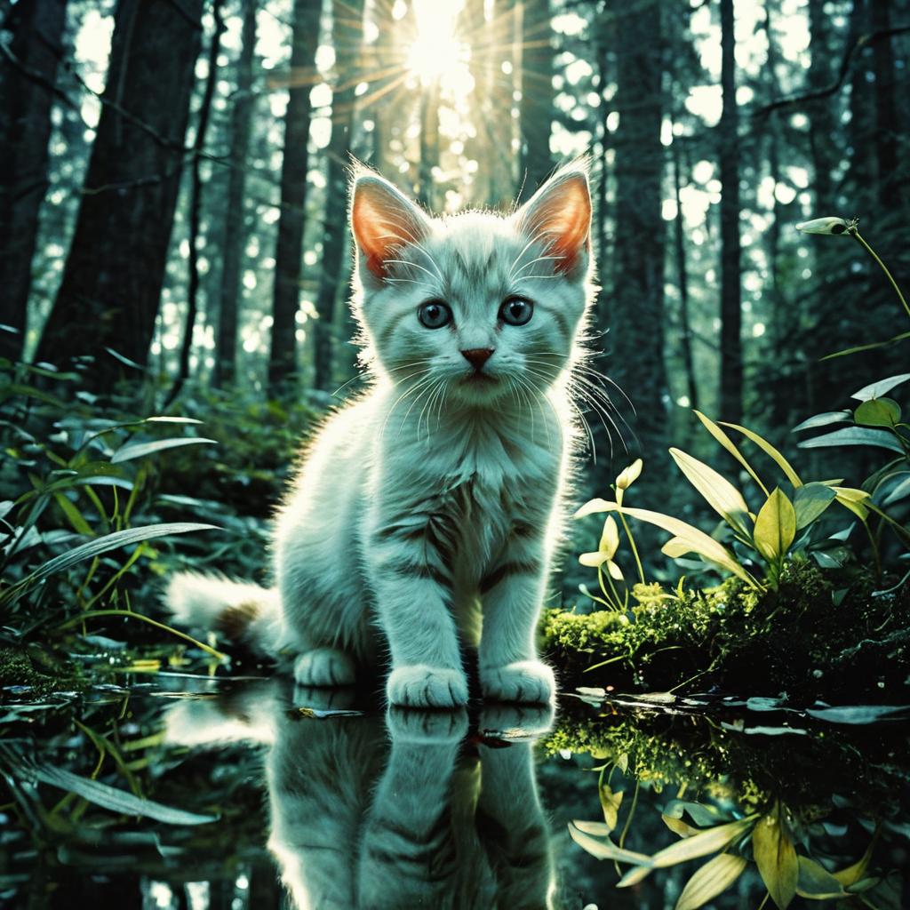 A hyperrealistic close-up of a translucent kitten standing on a reflective water surface in a dense forest. The image features a soft bloom effect and glowing highlights, with intricate detailing on the kitten’s fur and clear reflections. Surrounding foliage and tall trees create a serene and mystical atmosphere, enhanced by matte and glossy textures.