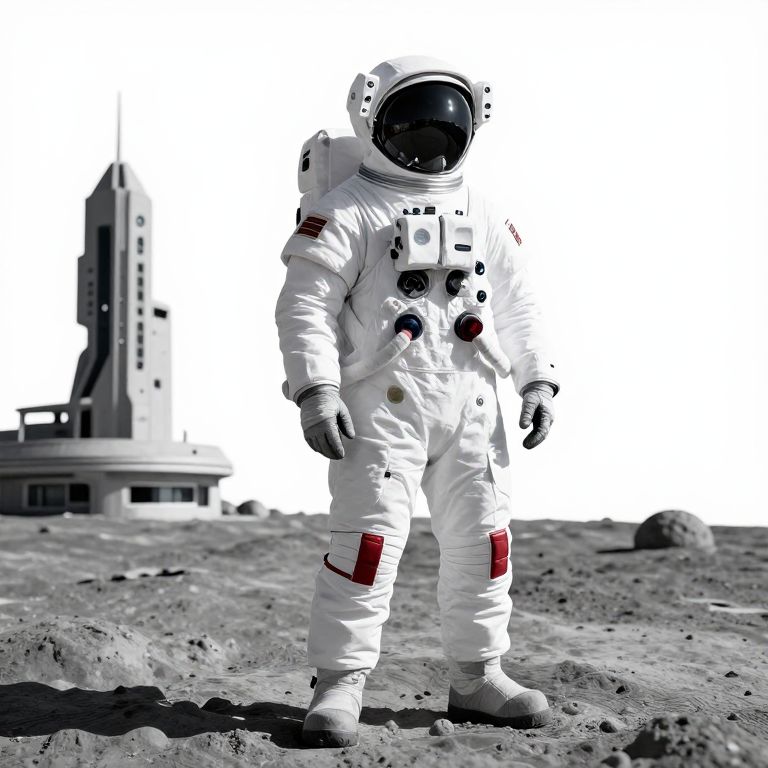 Photograph of an astronaut standing on a lunar-like, rocky surface. The astronaut, clad in a white, bulky spacesuit with a black, reflective visor, is centered in the image. The suit features red patches on the knees and chest, and various black and white buttons and equipment. In the background, there's a large, cylindrical, white structure with a flat roof and small windows. The sky is stark white, contrasting with the dark, textured lunar ground. The astronaut's posture is relaxed, with arms slightly bent at the elbows and feet firmly planted. The overall image has a high-contrast, slightly surreal style.