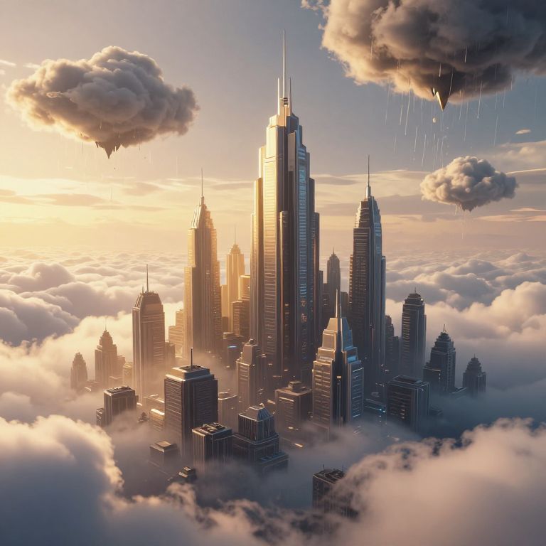 A fantastical 3D-rendered cityscape emerges from the clouds, its spires piercing the sky like jagged teeth, bathed in the ethereal glow of golden-hour lighting, evoking a cyberpunk-inspired vision of cloud cities governed by the whims of wandering raincloud barons.