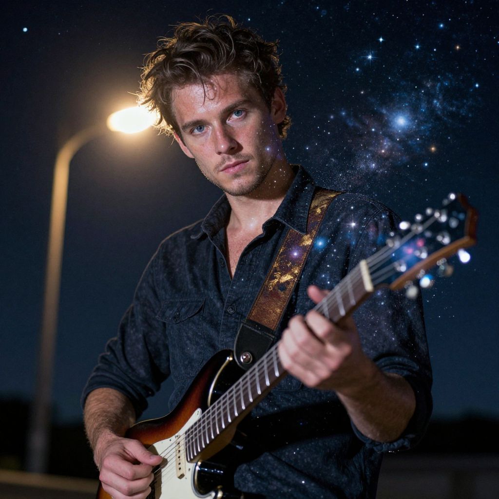 A captivating double exposure portrait showcases a confident male musician entangled with the cosmic beauty of a starry night sky. The subject, an intriguing young man with piercing blue eyes and a subtle hint of stubble on his chin, strums an electric guitar beneath the soft glow of a street lamp. His striking features are accentuated by wisps of shimmering light from distant galaxies, appearing to emanate from his instrument. As celestial bodies gracefully dance across his face and body, they create a mesmerizing interplay between music's tangible world and the ethereal realm beyond our grasp. The rich color palette, comprising deep blues, silvers, and golds, evokes a sense of wonder and longing for the unknown, serving as a vivid reminder that art possesses an extraordinary ability to transcend dimensions.