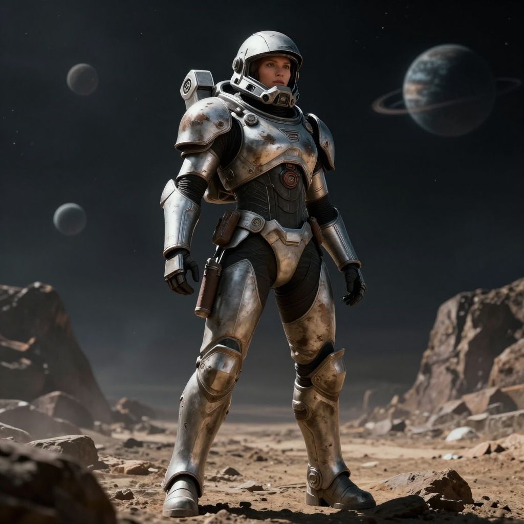 Female space marine art, heroic stance on rocky alien terrain, heavy armor with battle damage, helmet off revealing determined face, distant planets and moons visible, high contrast, epic mood