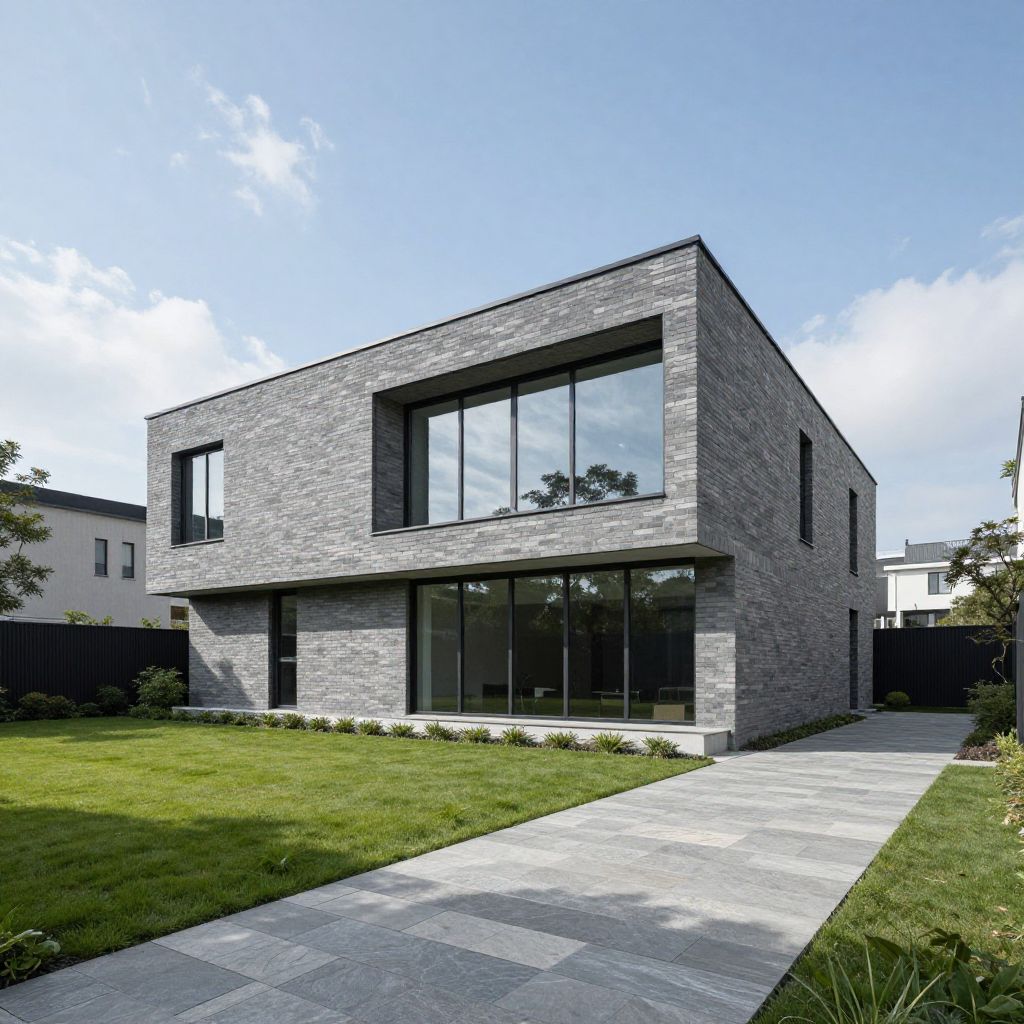 Modern grey brick house with sleek minimalist architecture, large glass panels, flat roof, surrounded by a manicured lawn and artistic stone pathways, set against a clear blue sky with subtle clouds, highlighting urban elegance with natural elements.
