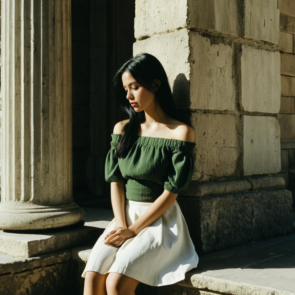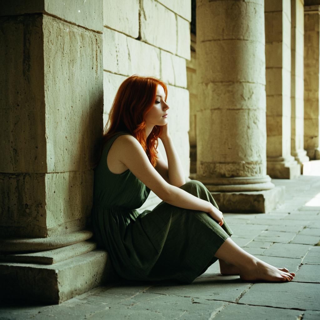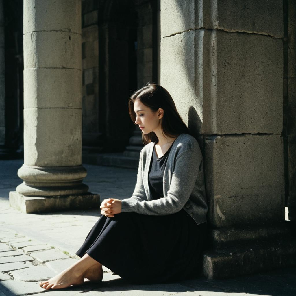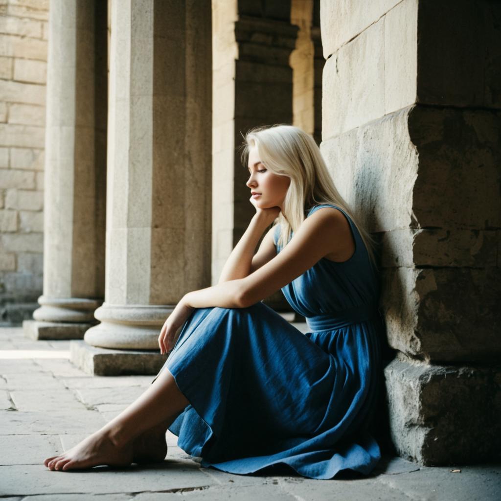 A young woman with platinum blonde hair in a blue flowy dress sitting thoughtfully against a large stone pillar of an old building, soft natural light casting warm shadows, muted earth tones in the architecture, a calm and contemplative mood, cinematic style photograph