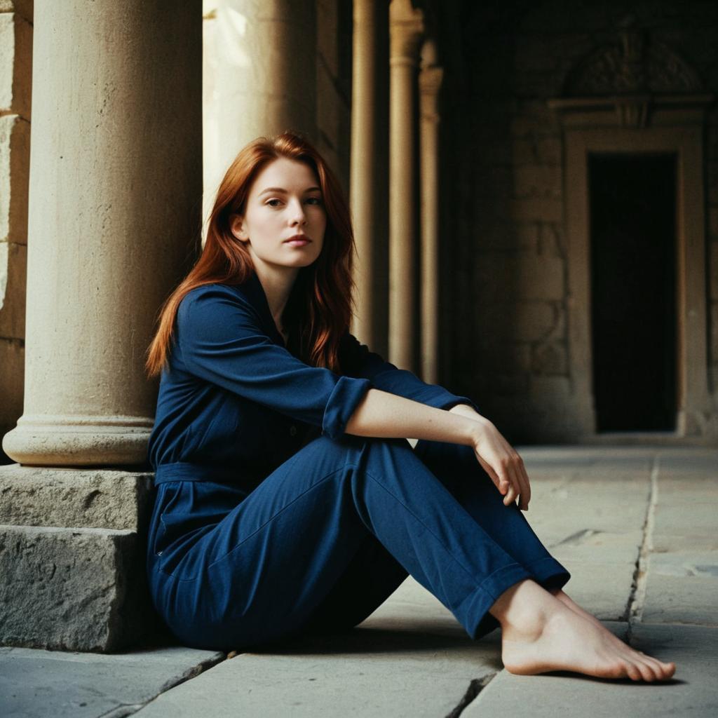 A young woman with platinum blonde hair wearing a blue flowy dress sits barefoot against a large stone pillar in an old building. The architecture features muted earth tones and massive stone columns. Soft natural light creates warm shadows, enhancing the calm and contemplative mood of the cinematic style photograph.