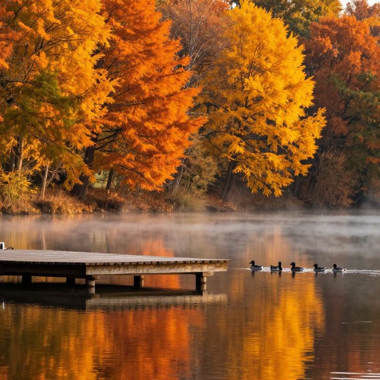 Photograph of a serene lake at dawn with a wooden dock, vibrant orange and yellow autumn leaves, and five ducks floating on mist-covered water.