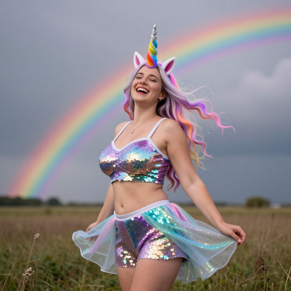 Photograph of a smiling woman with long, wavy, pastel purple hair wearing a unicorn horn headband with pink ears. She is dressed in a shiny, silver sequin bra and matching sequin shorts with a translucent, iridescent tulle overlay. She stands in a grassy field under a cloudy sky with a vibrant rainbow arching across the background. Her skin is fair, and she has a curvy, fit physique. The colors of the rainbow enhance the iridescent quality of her outfit. The mood is playful and magical.