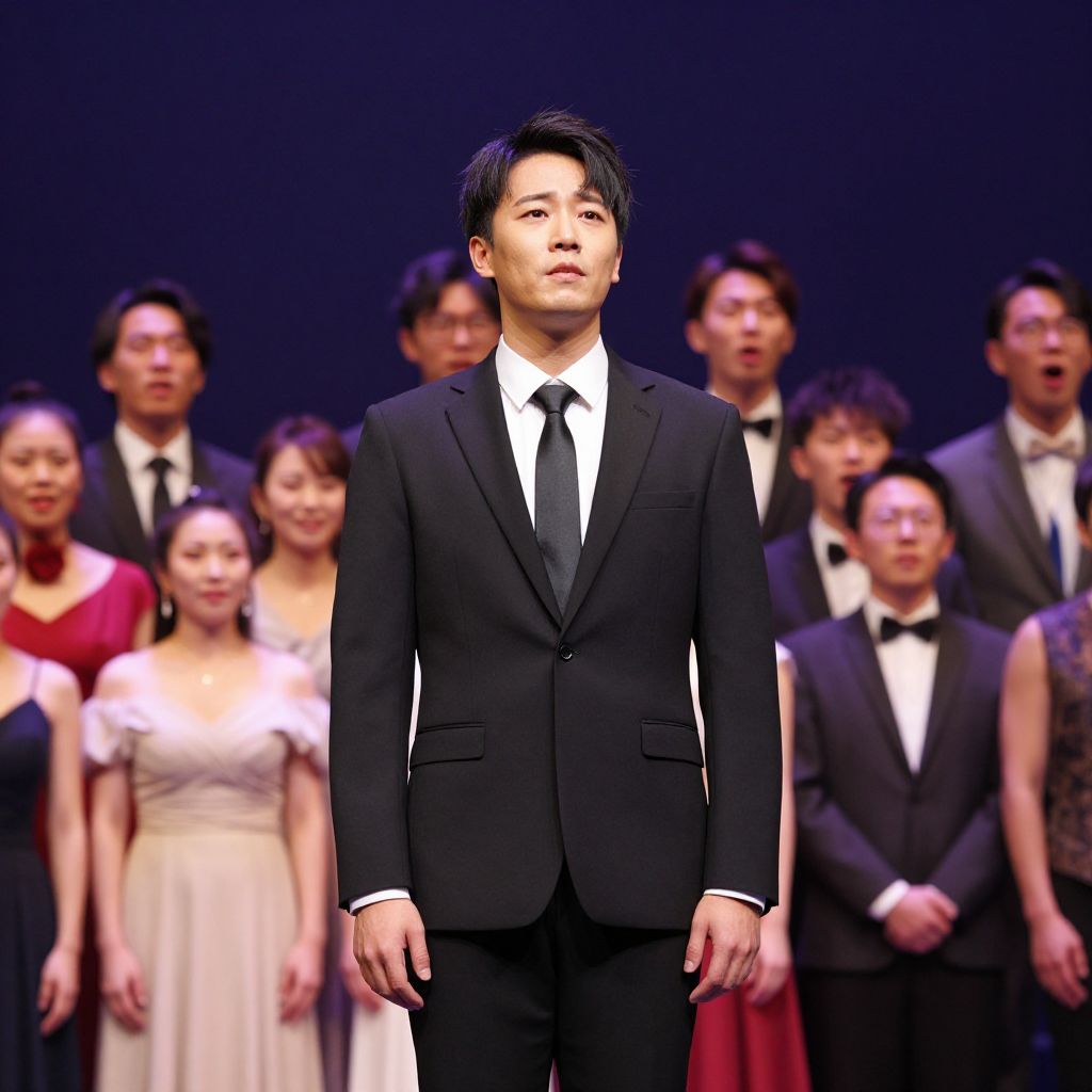 Photograph of an Asian male model standing center stage, wearing a black tuxedo with a white shirt and black tie. He has short black hair and a neutral expression. Behind him, a diverse group of Asian men and women, dressed in formal attire, stand in a slightly blurred background. The women wear various colored evening dresses, while the men are in tuxedos with bow ties. The stage has a dark blue backdrop, and the lighting focuses on the central figure, creating a spotlight effect. The overall scene suggests a formal event or performance.