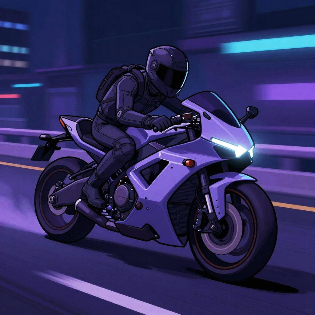 Thick outline art of a retro futuristic motorcycle speeding on an urban highway, thick black contours highlighting sleek curves and glowing neon accents, cyberpunk color palette with dark purple and electric blue hues, energetic motion blur