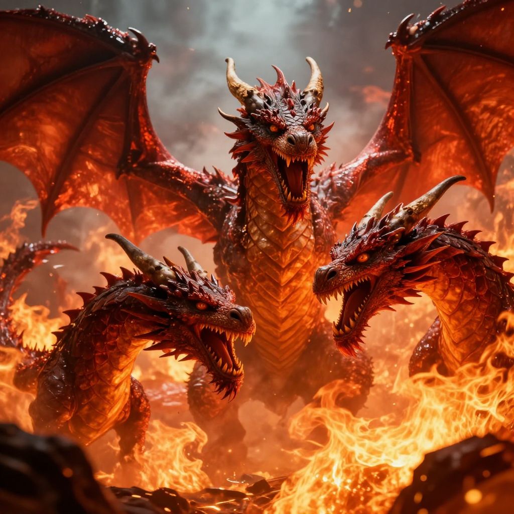 Photograph-style digital artwork depicting a ferocious, three-headed red dragon with sharp horns, scales, and glowing eyes. The dragon's wings are spread wide, engulfed in fiery flames. Each head is snarling, revealing rows of sharp teeth. The background is a chaotic mix of bright orange flames and dark, smoky clouds. The dragon's scales glisten with a fiery sheen, adding to the intense and dramatic atmosphere. The image is highly detailed, emphasizing the dragon's menacing and powerful presence amidst the fiery inferno.