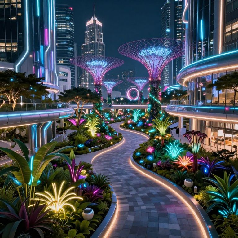 Lote, a futuristic city park where bio-engineered lote plants grow alongside neon-lit pathways, blending nature and technology, cyberpunk aesthetics with glowing plants, sleek metallic architecture, dynamic lighting effects creating a vibrant urban ecosystem