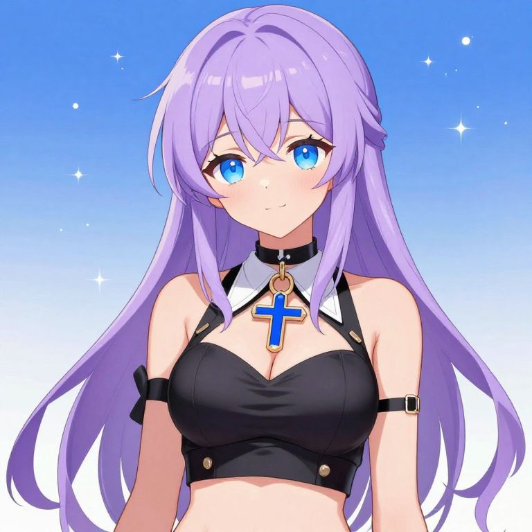 This is a digital anime-style illustration of a young woman with long, lavender-purple hair and large, bright blue eyes. She wears a black, strappy crop top that reveals her midriff and accentuates her medium-sized breasts. A black choker with a gold ring and blue cross pendant adorns her neck. Her skin is fair, and she has a slight blush on her cheeks. The background is a gradient of blue to white with small, sparkling stars. Her hair is straight and flows past her shoulders. The overall style is vibrant and cute, with a focus on detailed, colorful character design.