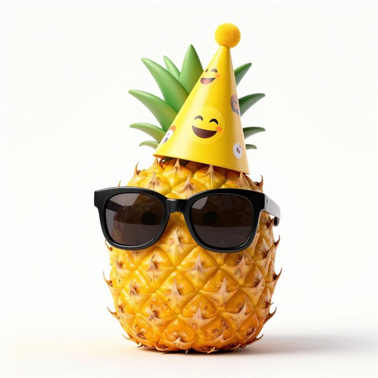 A vibrant 3D-rendered pineapple dons stylish black sunglasses and a festive yellow party hat adorned with playful emoji designs, exuding a quirky and fun artistic style against a clean white background.