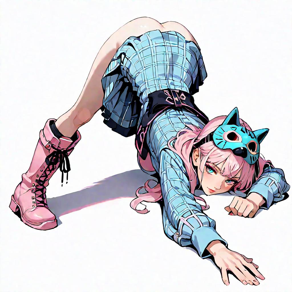 (by kame \(kamepan44231\):0.9), score_9, best quality, masterpiece, uncensored, source_animehata no kokoro, bubble skirt, 1girl, solo, bangs, simple background, long sleeves, white background, full body, boots, mask, top-down bottom-up, pink footwear, mask on head, plaid shirt