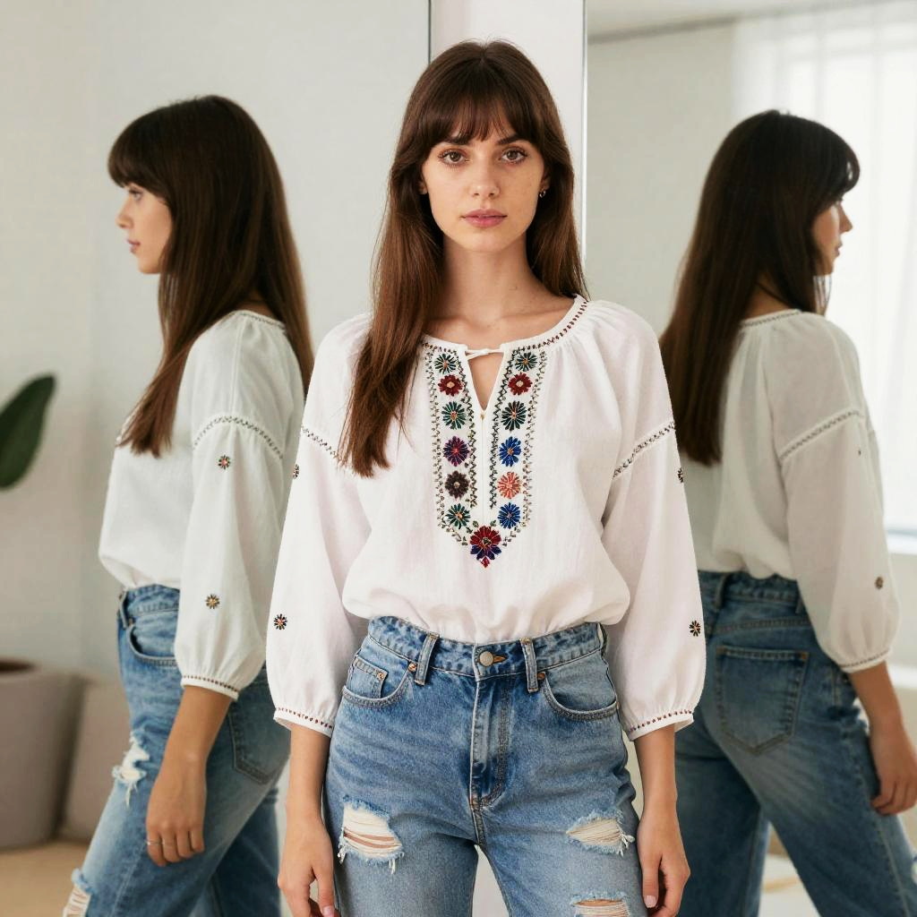 Photograph of a young woman with fair skin and straight, dark brown hair with bangs, standing in a bright room. She wears a white, long-sleeved blouse with embroidered floral patterns in black, red, and blue on the chest and sleeves, and high-waisted, blue, distressed jeans with rips on the thighs. She faces forward, with her reflection visible in two mirrors behind her. The room has white walls and a green potted plant in the background. Her expression is neutral, and she stands with her arms relaxed by her sides. The image has a crisp, clean, and modern aesthetic.