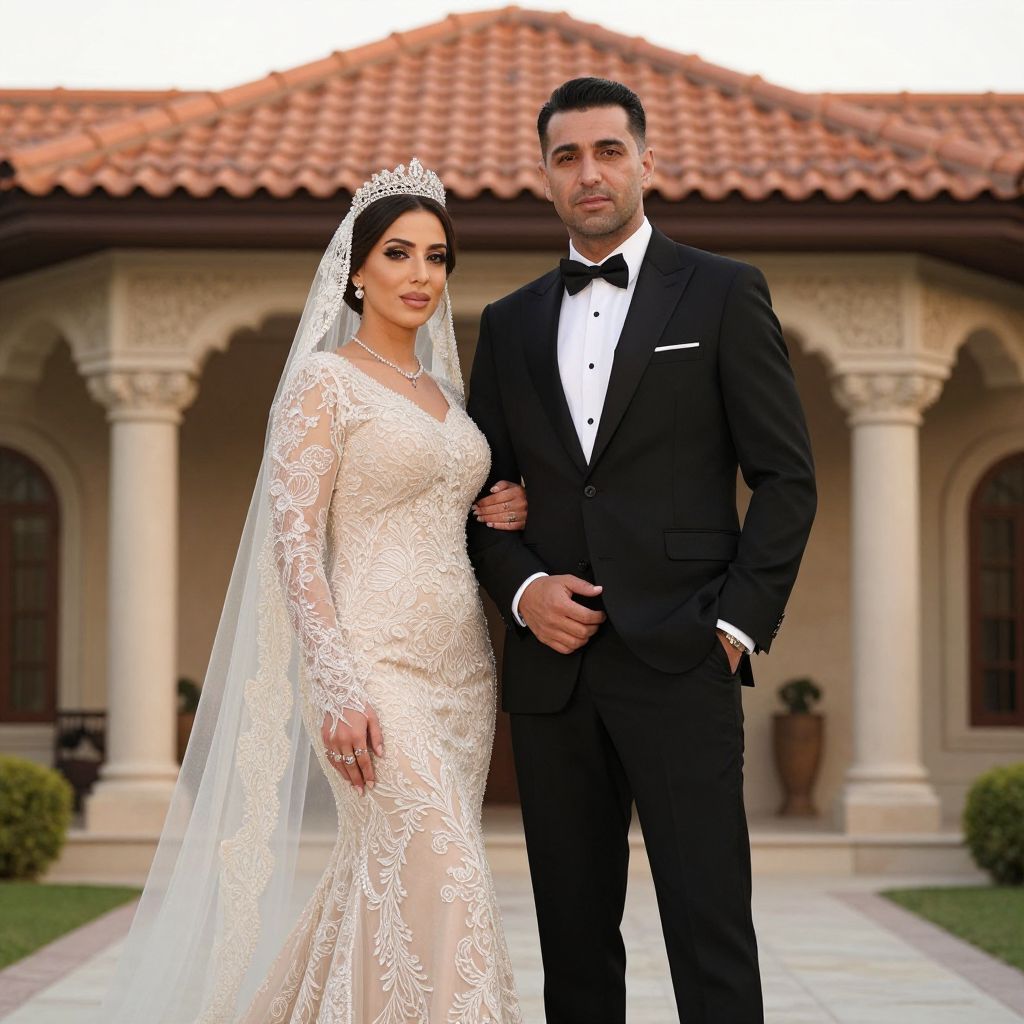 Omar Borkan Al Gala stands proudly beside his bride, both dressed in elegant wedding attire, with Omar in a sharp black suit and the bride in a stunning lace gown adorned with a sparkling tiara, set against the backdrop of a grand mansion with terracotta roofing and ornate columns.