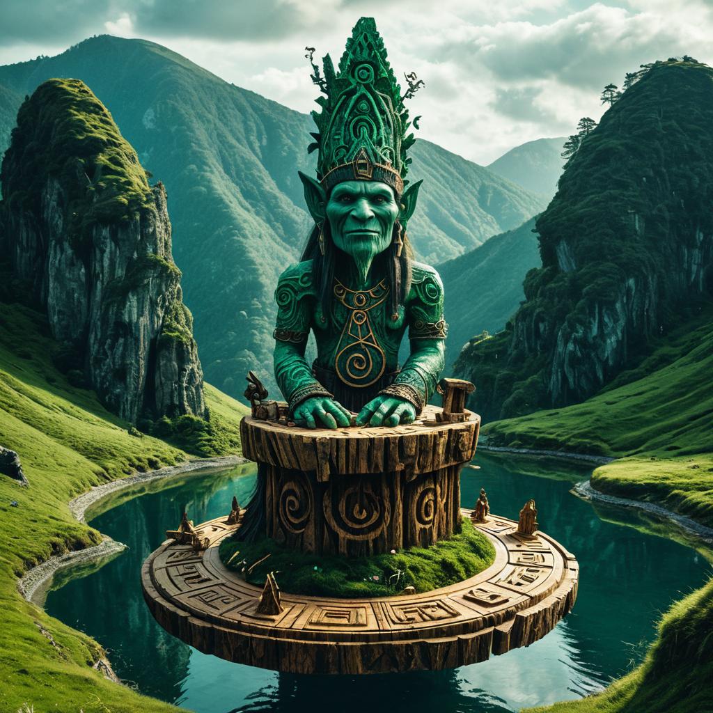Surreal fantasy artwork of a troll sculptor carving a giant ancient singing totem, in a floating island above rolling emerald hills, with wood shavings floating, mystic runes sparkling, ghaurio sieport sham ghost, dreamlike and magical, highly imaginative and otherworldly