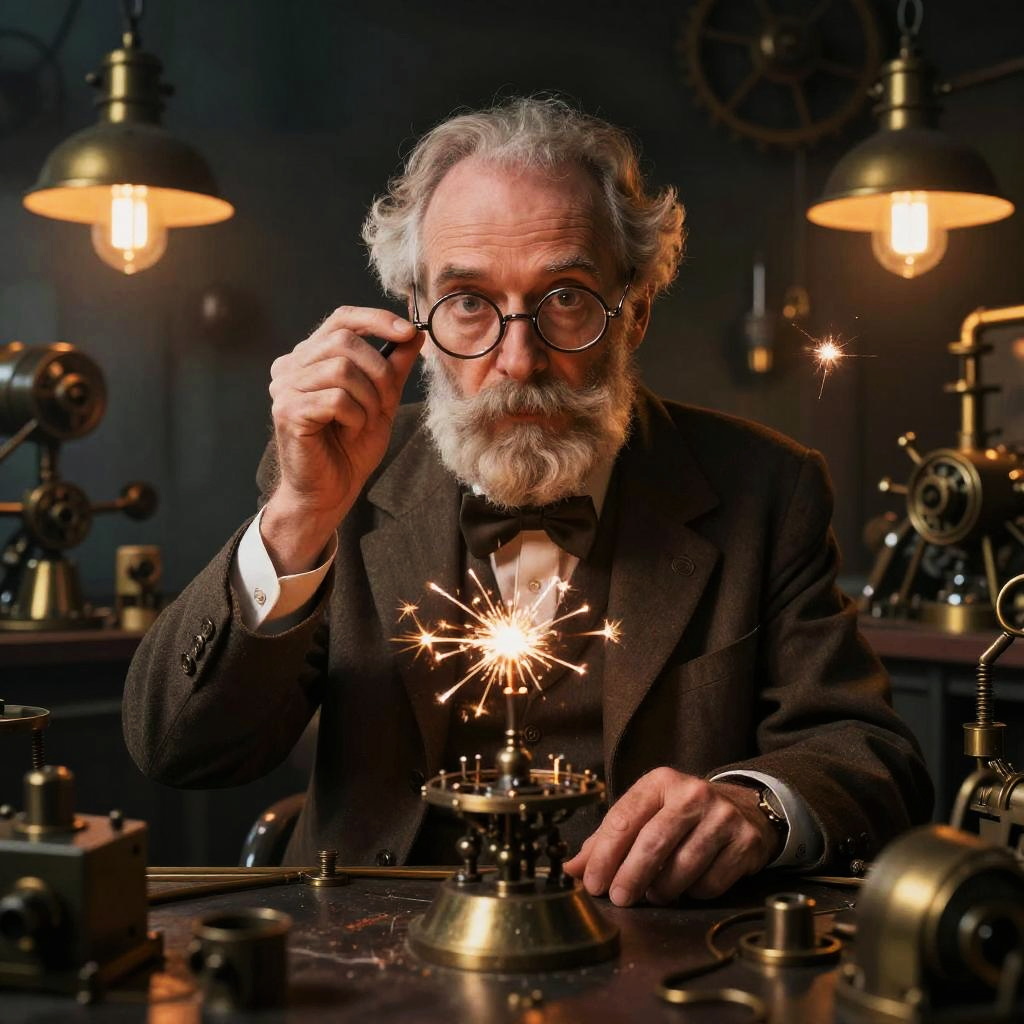 Uncle Fester with glasses, electric sparks around him, mad scientist vibe, steampunk laboratory, detailed mechanical props, atmospheric lighting, surreal style