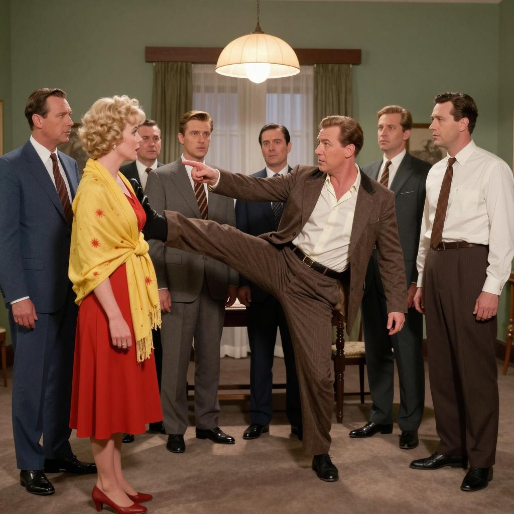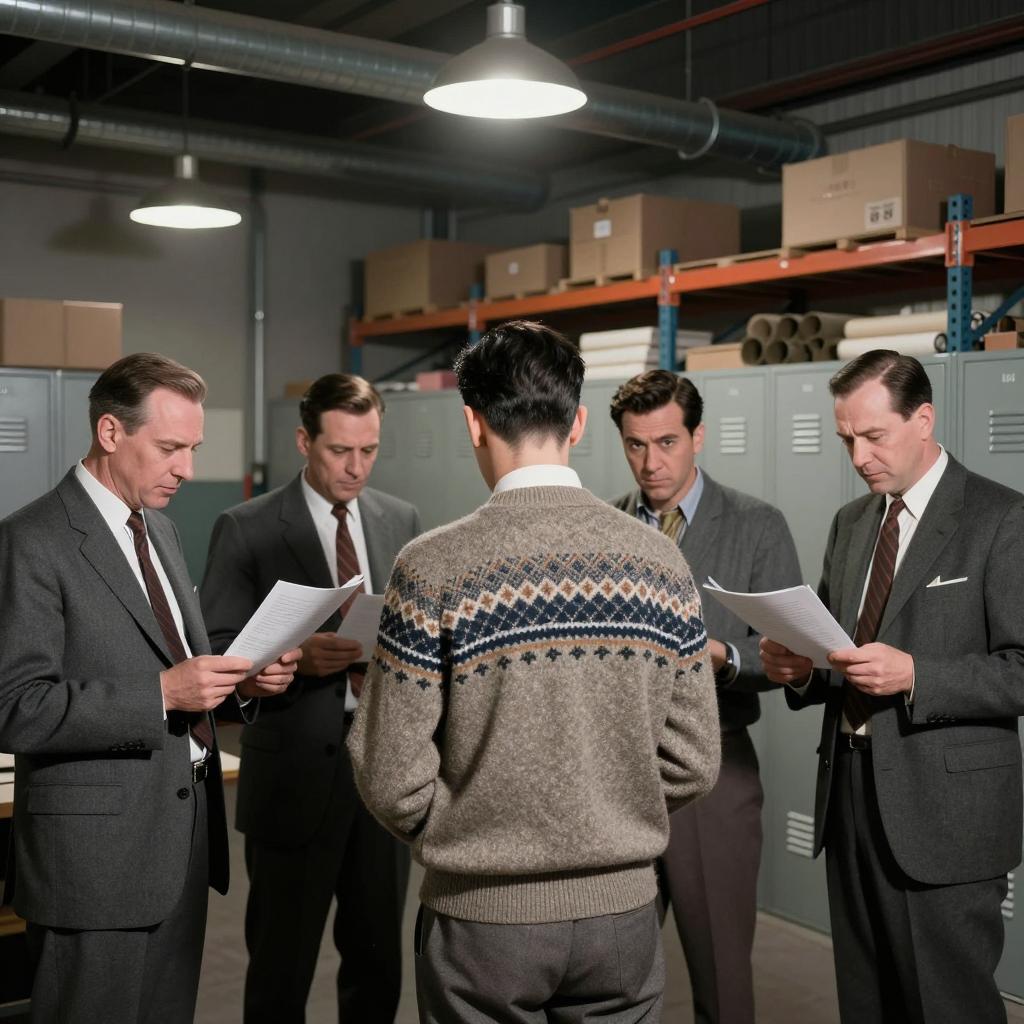 Industrial warehouse with six men. One man in patterned sweater with short black hair, back to camera, center. Three men in suits, left, right, and middle, reading papers. One man in sweater, middle right, intense expression. Man in suit, right, holding papers, looking down. Overhead lights, exposed pipes, metal lockers. Shelves with boxes and rolls, background. Industrial setting, 1960s style.