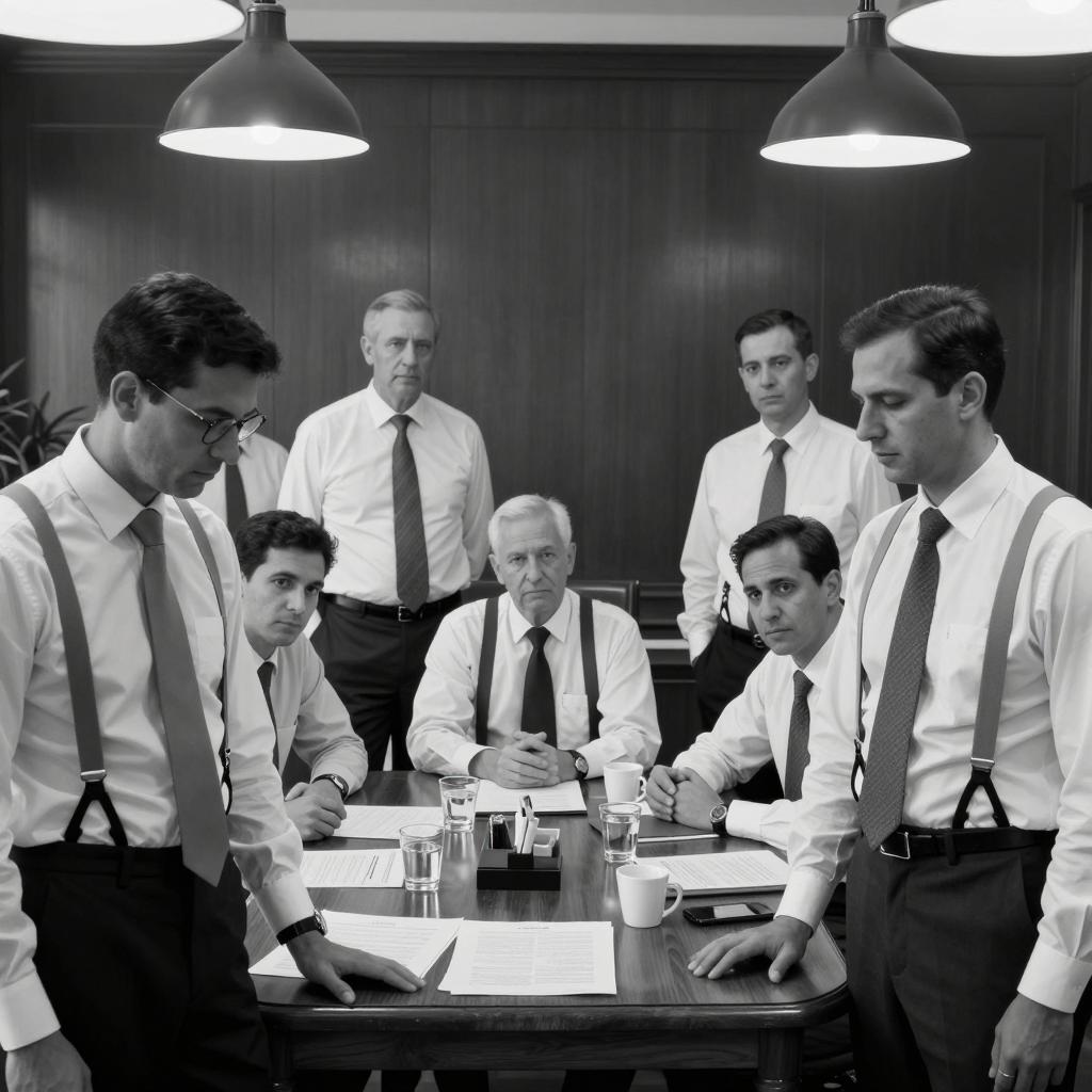 A group of five men in a 1960s-style industrial warehouse setting. Four men wear formal suits with ties, reading papers intently, while one man in a patterned sweater stands with his back to the camera. The background includes metal lockers, industrial shelving with cardboard boxes and rolls, exposed pipes, and overhead lighting fixtures.