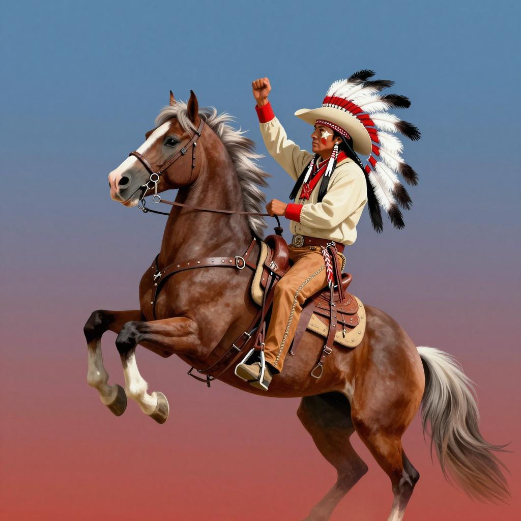 Illustration of a Native American man riding a rearing brown horse with white mane. Man wears a beige cowboy hat, star-shaped chest badge, and leather outfit. Horse has red and white feathered headdress. Man's face is obscured by mask. Background features gradient sky from blue to red. Man's right arm raised, left arm down. Horse's front legs lifted, head facing left. Both man and horse centered.