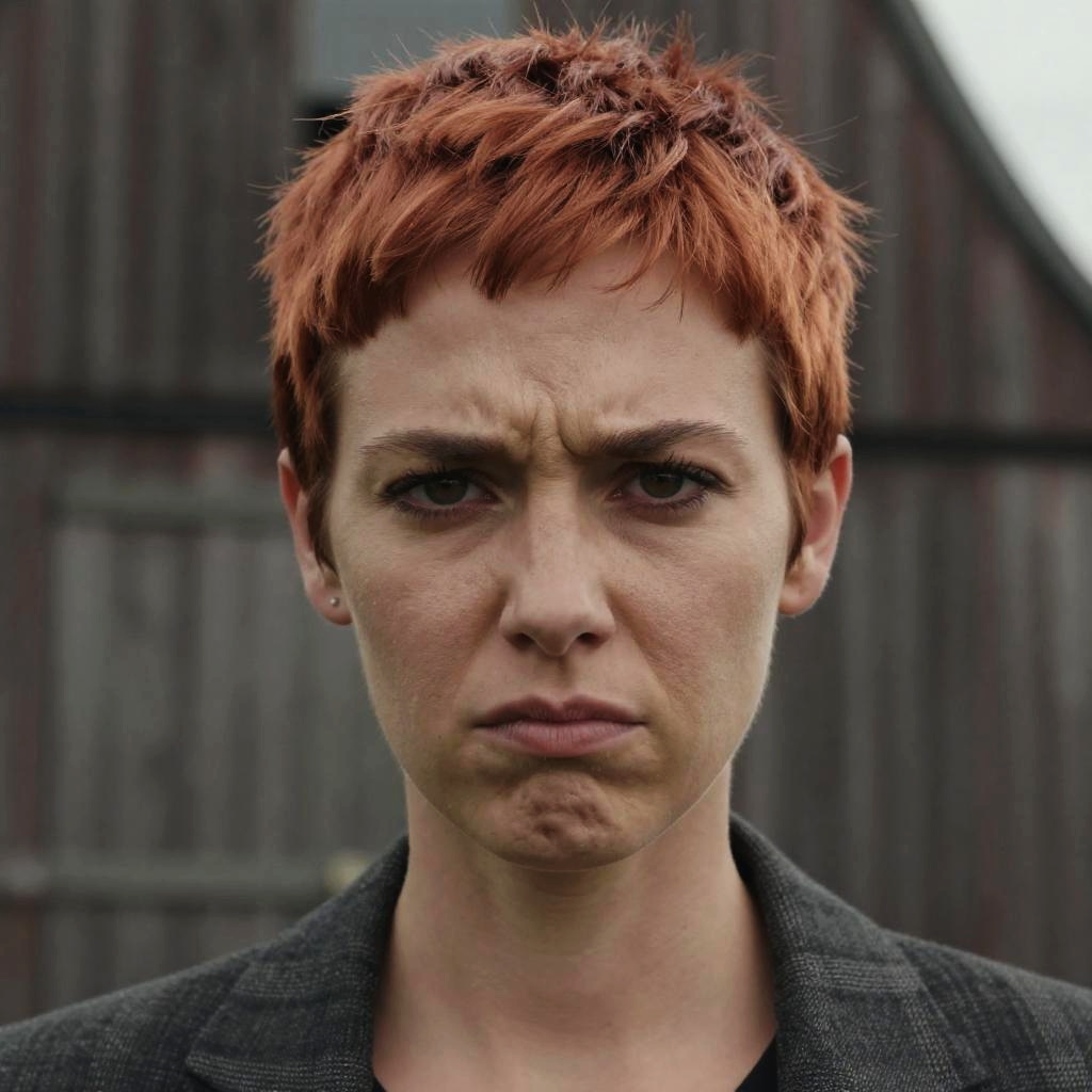 Closeup portrait of skswoman, frown, wearing tailored, with copper Blunt haircut, background barn epic (photo, studio lighting, hard light, sony a7, 50 mm, matte skin, pores, colors, hyperdetailed, hyperrealistic)