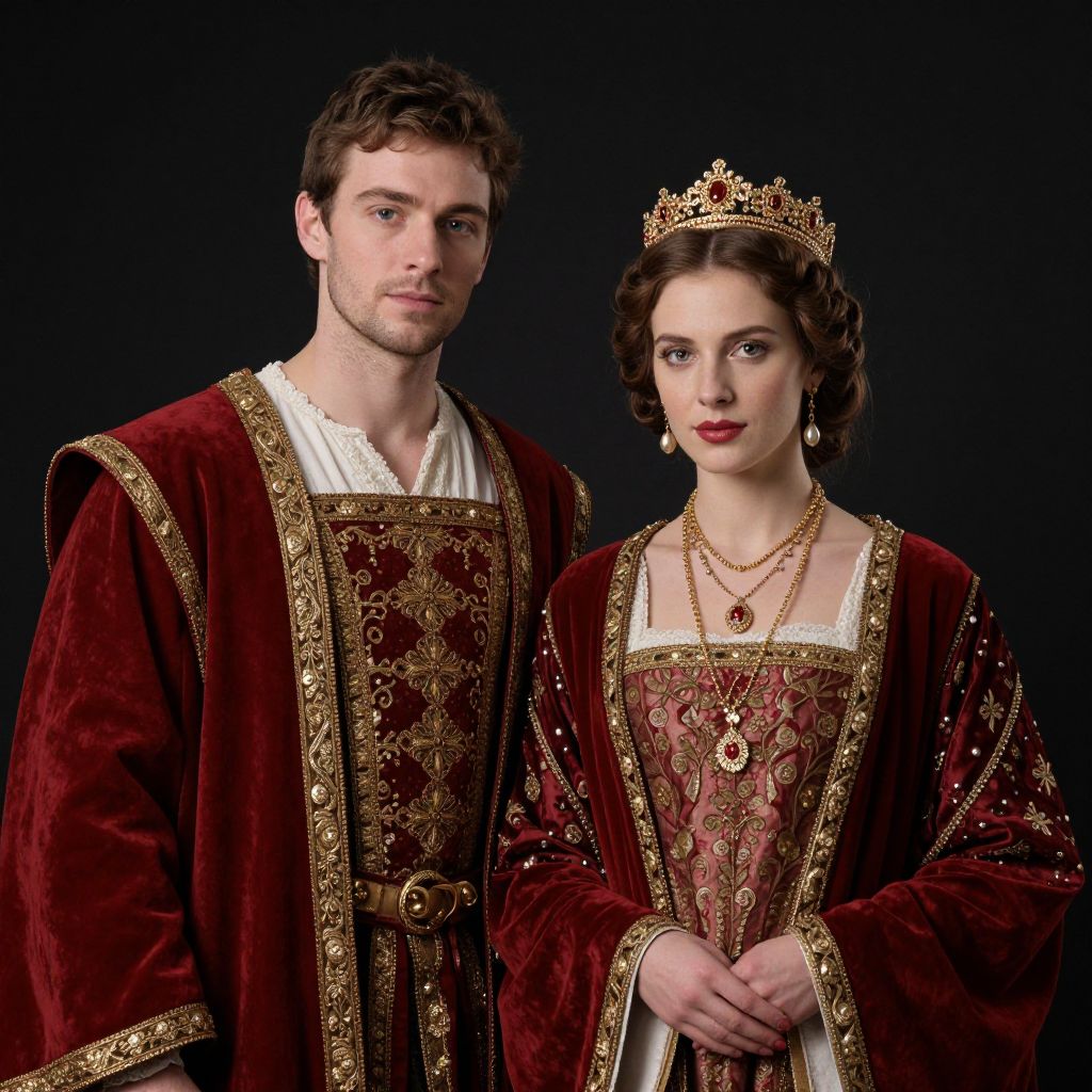 Elegantly dressed couple in richly detailed medieval attire, featuring a man in a crimson robe with gold embellishments and a woman adorned with a tiara, necklace, and matching gown, exuding regal charm against a dark backdrop.