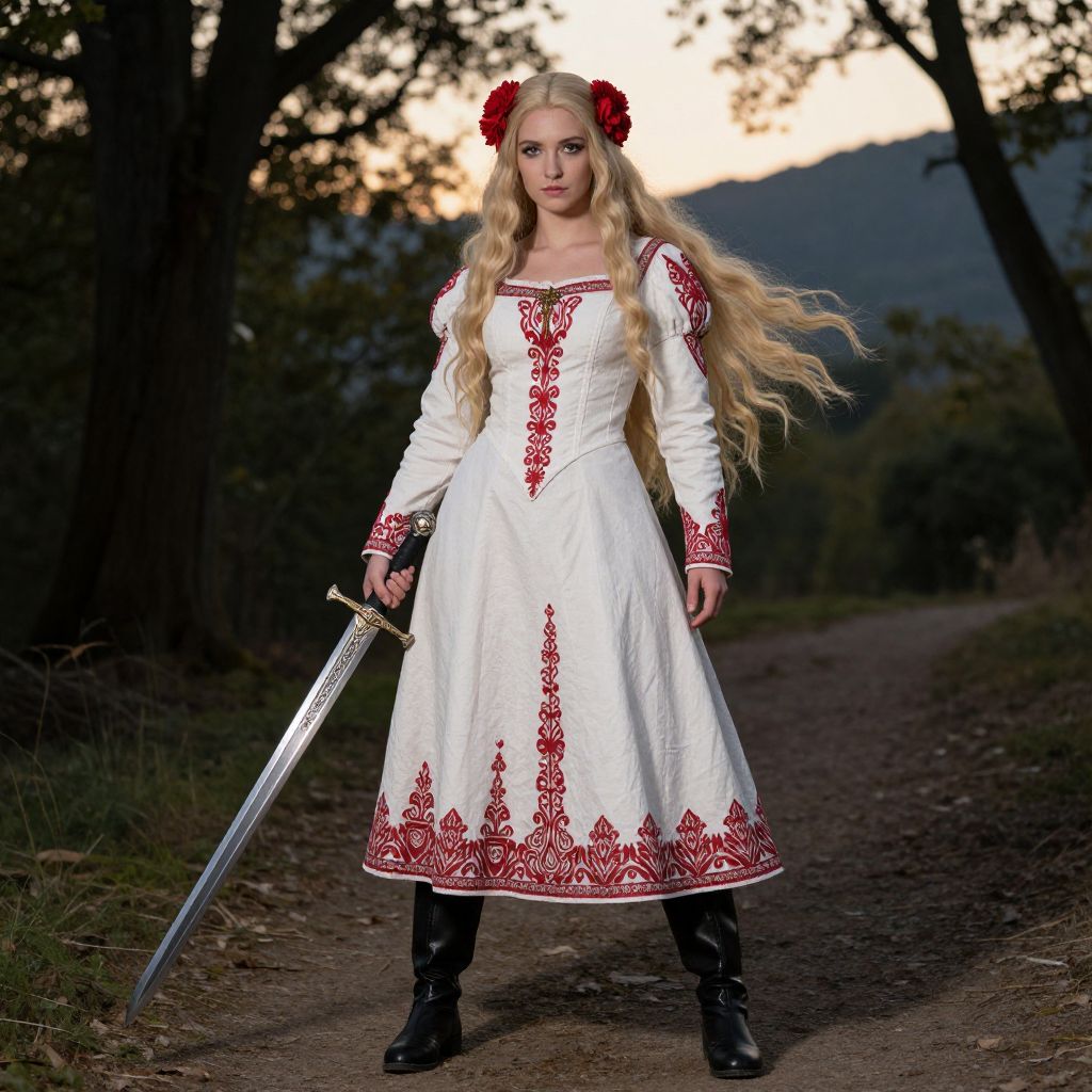 A beautiful female character with long, flowing blonde hair adorned with vibrant red flowers, her hair cascading gracefully over her shoulders. She wears a detailed medieval costume featuring a white linen skirt with rich red embroidery and red trim along the sleeves and hem, giving it a regal and elegant appearance. She stands confidently with a sharp, ornate sword in her right hand, the blade gleaming under soft light. Her black leather boots are polished and sturdy, suited for both combat and adventure. Her expression is bold and determined, with a hint of mystery in her eyes, as if she's about to embark on a crucial journey. The background is a sun-dappled forest path at twilight, with trees and distant mountains in the distance, adding depth and atmosphere to the scene.