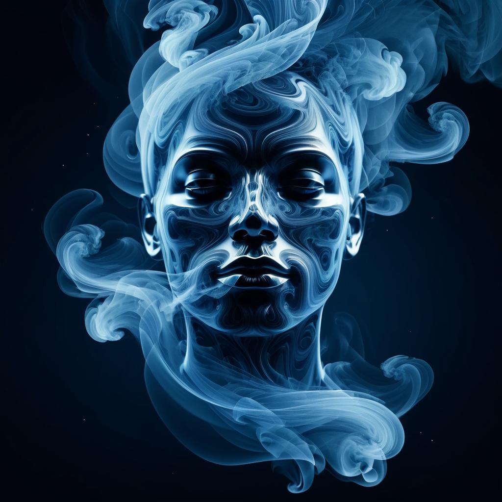 Digital artwork depicting a surreal human face formed by intricate swirling smoke patterns and detailed particles. The face appears serene with closed eyes, emerging from a cloud of smoke in shades of blue and black, creating a mystical and abstract atmosphere.