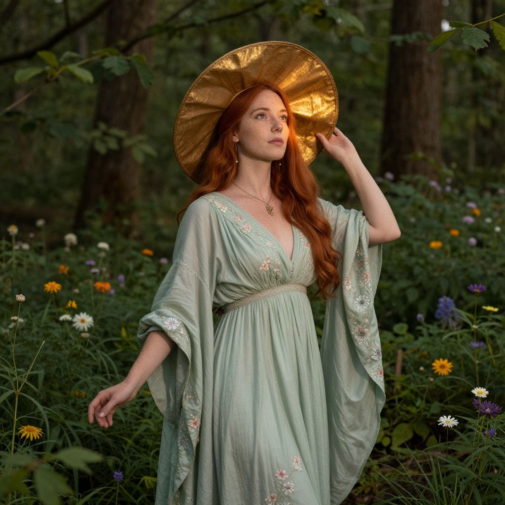 In this enchanting scene, a woman with ginger hair and freckles stands gracefully amidst a lush, verdant forest, her presence evoking a sense of ancient wisdom and mystery. She is adorned in a flowing, pale green dress with delicate floral embroidery, complemented by a large, golden hat that casts a warm glow upon her face. The background is a rich tapestry of greenery, with vibrant flowers and foliage creating a sense of depth and movement. The interplay of light and shadow enhances the ethereal quality of the scene, while the woman's serene expression and the intricate details of her attire suggest a narrative of initiation and transformation. The overall composition, with its harmonious blend of natural elements and the woman's poised stance, evokes a sense of sacred grove and esoteric ritual, inviting the viewer to explore the depths of the image's symbolism and meaning.