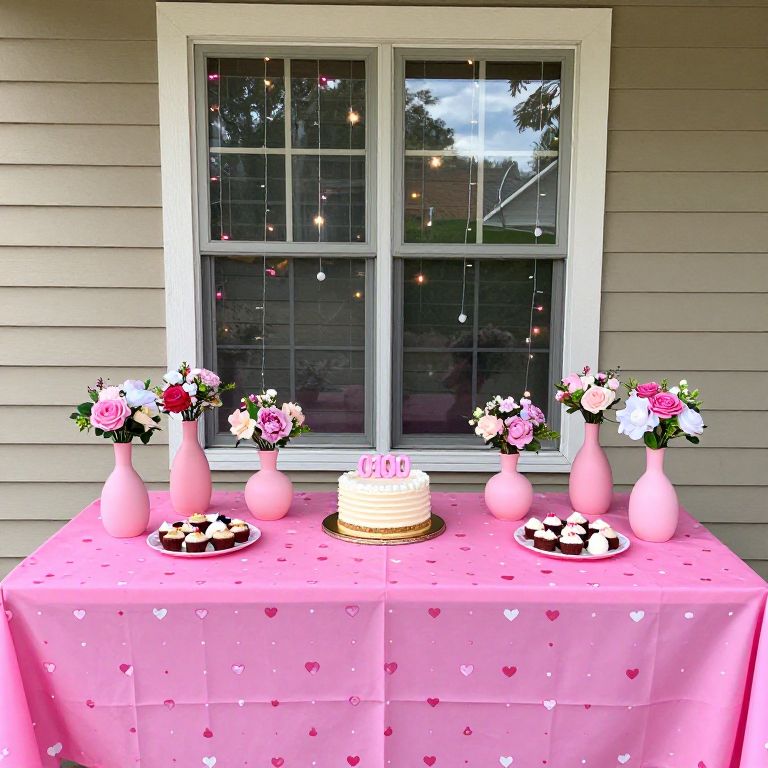 Outdoor birthday celebration setup featuring a vibrant pink tablecloth adorned with heart patterns, six pink vases with floral decorations, three plates of assorted treats, a central cake labeled \"0100,\" and a window backdrop decorated with pink and white string lights, all set against a beige siding wall.
