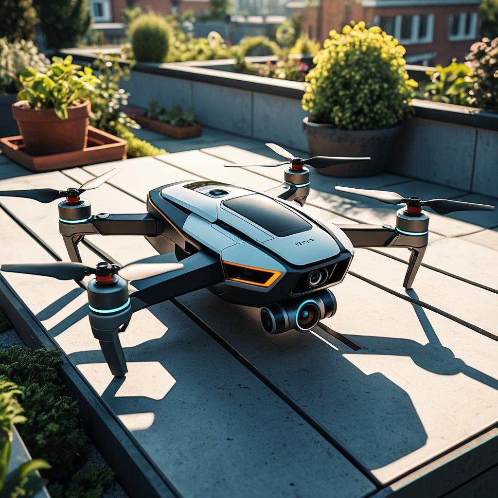 A sleek, futuristic drone with a white and black body and four rotors is placed on a sunlit rooftop garden patio. The drone features smooth, aerodynamic shapes and a panoramic camera mounted underneath. Surrounding the drone are various potted plants and greenery with a cityscape blurred in the background under bright daylight.