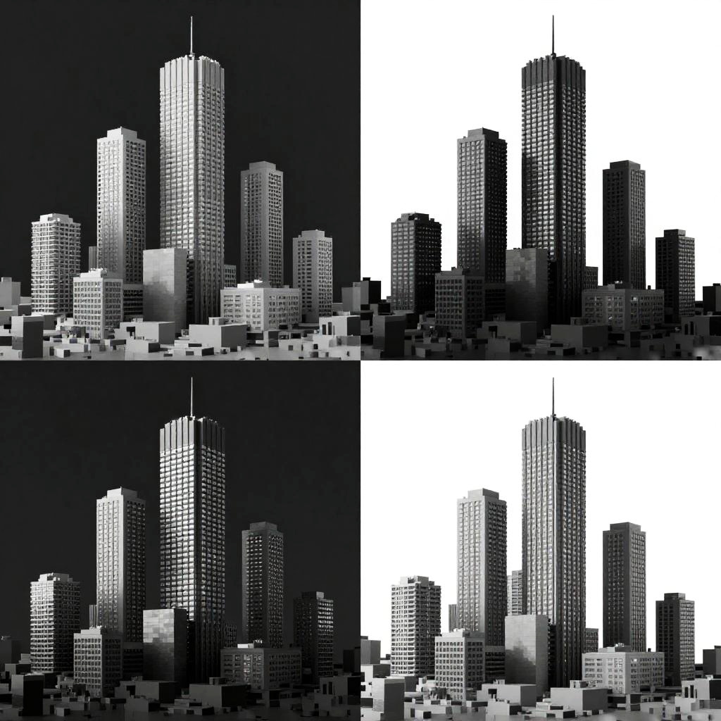 Digital black-and-white cityscape with pixelated skyscrapers, split into four quadrants with varying dark and white backgrounds. High contrast, modern urban