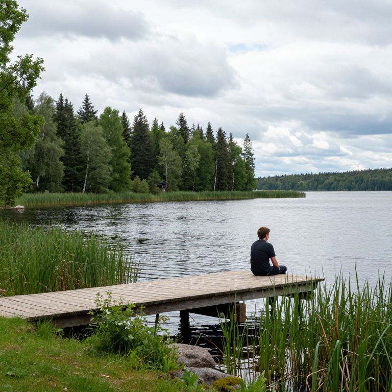 A serene lakeside scene in Bohuslän, Sweden, captures a lone figure sitting contemplatively on a wooden dock, surrounded by lush greenery and calm waters under a partly cloudy sky.