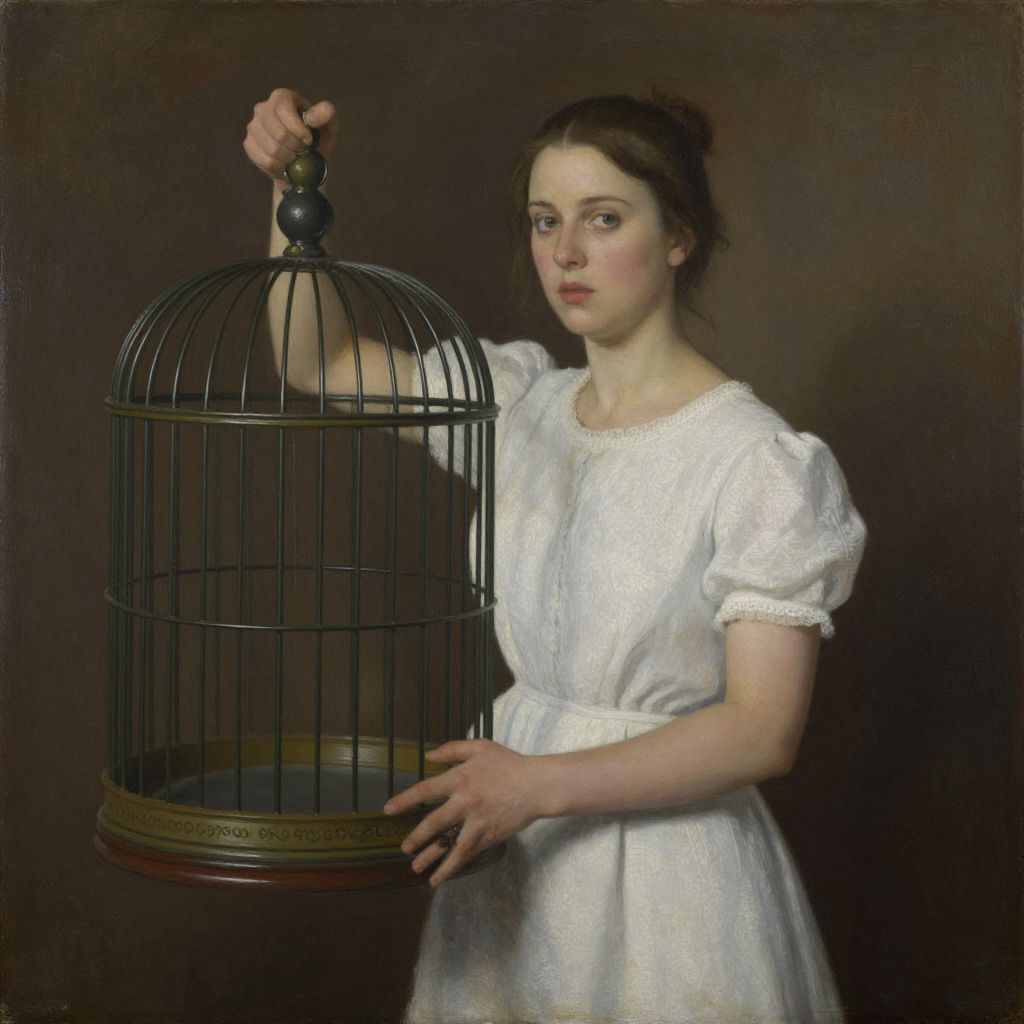 19th-century portrait of a fair-skinned young woman in a white dress holding a large, black birdcage with a dark background.