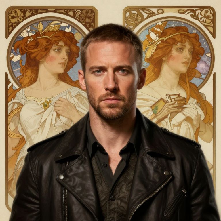 Photograph of a bearded, fair-skinned man with short brown hair and blue eyes, wearing a black leather jacket over a black shirt. He stands in front of two intricately drawn, Art Nouveau-style illustrations of a red-haired woman with a flower crown. The woman on the left holds a gold necklace, while the woman on the right holds a book. The background features ornate, circular frames with floral patterns. The man's expression is serious, and the overall image blends realistic photography with stylized, vintage artwork.