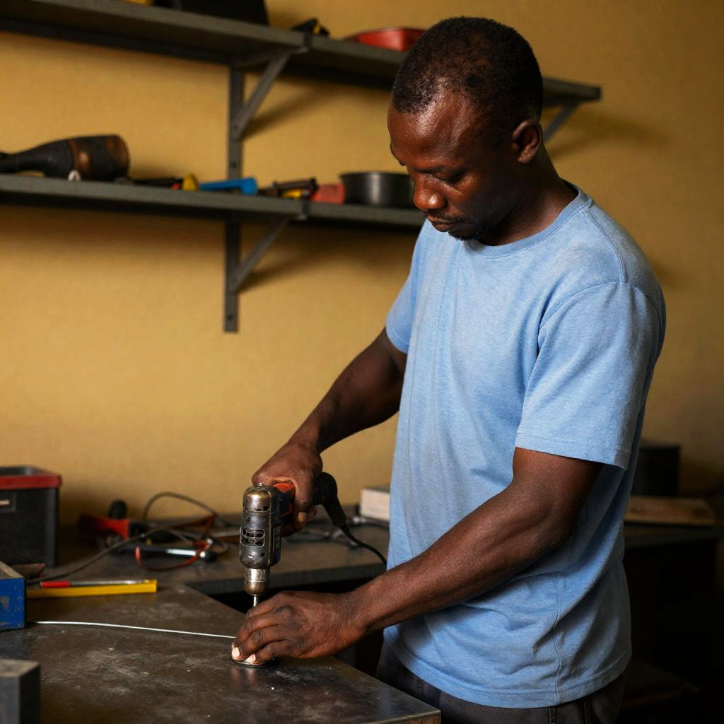 African man with dark skin, short black hair, wearing a light blue shirt, standing in a dimly lit, cluttered workshop. He operates a drill on a metal table, surrounded by tools and wires. Yellow wall with metal shelves in the background. Warm, yellow lighting. Casual posture, focused expression.