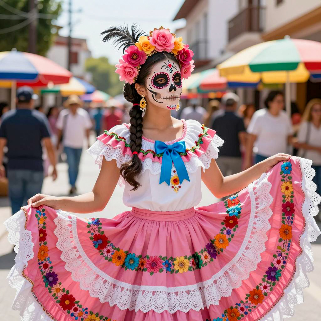 Fancy dress festival costume, photograph of young woman, Mexican Day of the Dead costume, pink and white dress with lace and floral patterns, puffed sleeves, blue ribbon bow, frilled layers, ornate pink headdress with feathers, dark hair in pigtails, street festival background, daytime, blurred people and buildings, bright sunlight, colorful umbrellas, lively atmosphere, focus on woman, vivid colors, cultural attire, traditional Mexican clothing