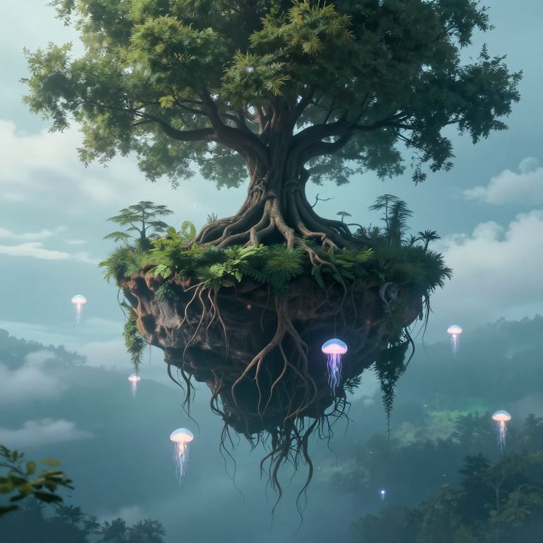 Digital artwork of a floating tree island with roots, surrounded by glowing jellyfish, set against a misty, blue sky. Fantasy style.