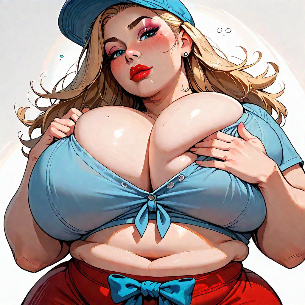 Score_9, score_8_up, score_7_up, score_6_up, score_5_up, score_4_up, best quality, masterpiece, highres, obese, middle-aged, female, pufferfish, blue shirt, red skirt, blue hat, blonde hair, red lipstick, pose, hyper hips, thick thighs, gigantic breasts, gigantic ass, close-up, bored, hands on own chest