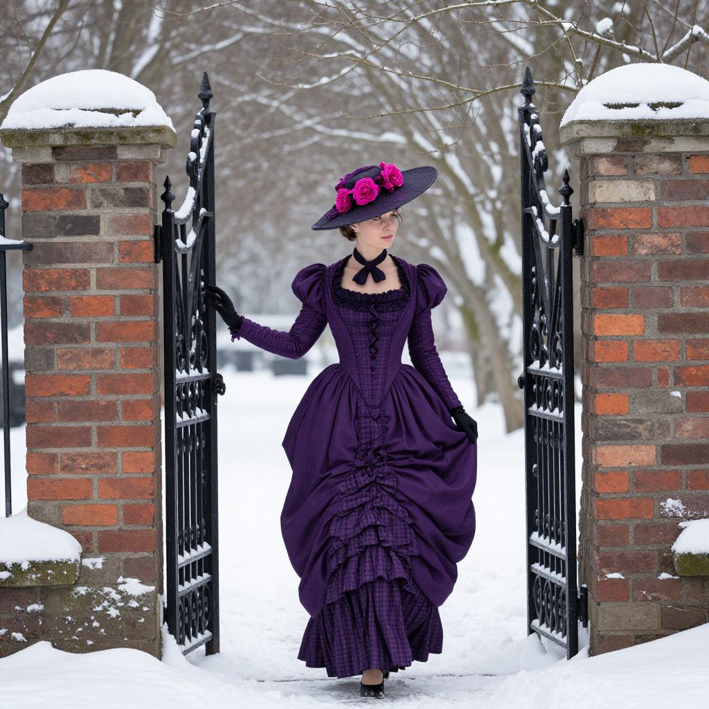 Woman in elegant Victorian attire, featuring a deep purple bustle dress with long sleeves, a fitted bodice, and a wide-brimmed hat adorned with vibrant pink flowers, gracefully walks through an ornate black iron gate set against a snowy backdrop, flanked by brick pillars and bare trees dusted with snow.