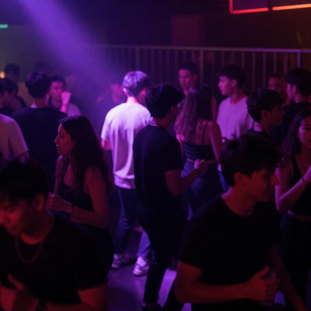 Photograph of a crowded nightclub with vibrant purple and pink neon lights. A woman with short dark hair and a black sleeveless top stands in the foreground, surrounded by other partygoers. Bright, glowing flames-like lights create a dynamic, energetic atmosphere. The background features dark, horizontal slatted walls and dim lighting.