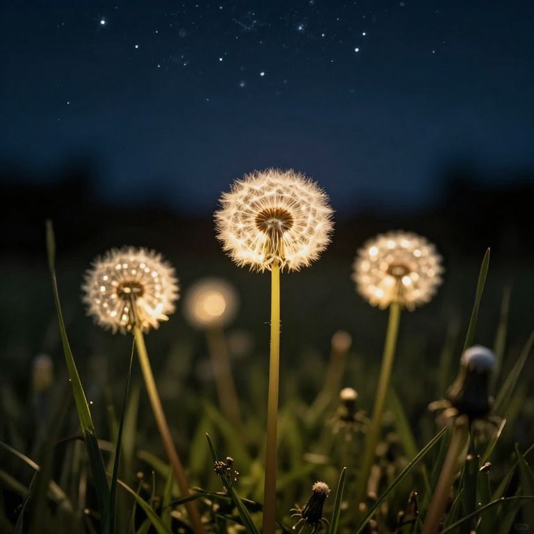 Photograph of glowing dandelions under a starry night sky, with blurred grass and dark background, highlighting the dandelion's bright, spherical