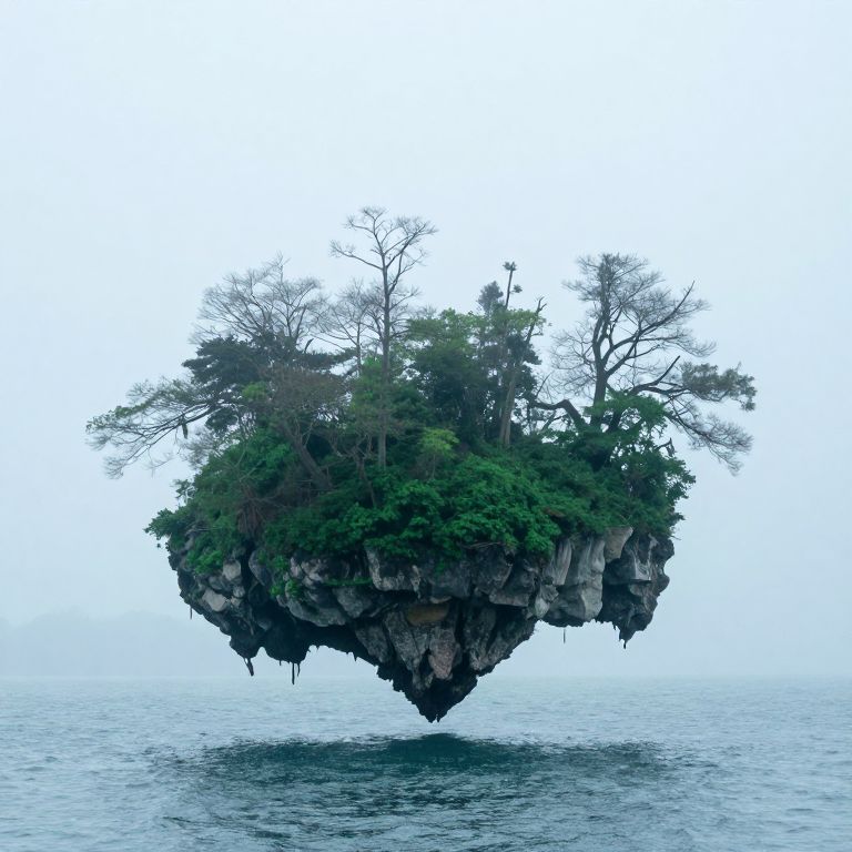 A jagged, emerald-hued island defies gravity as it hovers serenely above a tranquil sea, its silhouette framed by a misty veil and crowned with bare, ethereal trees that seem to reach toward an unseen horizon.