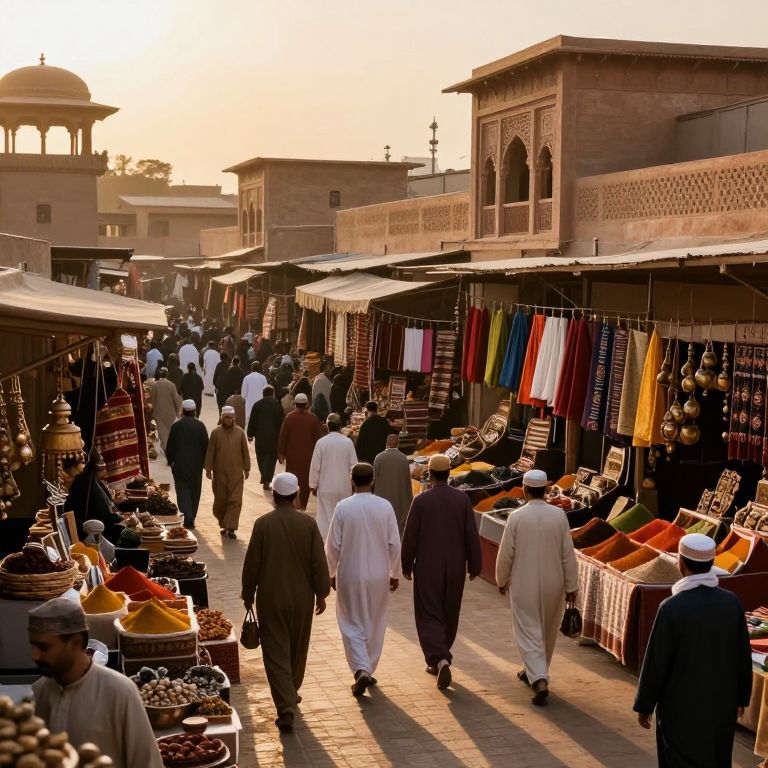 Photograph of a bustling Middle Eastern market at sunset, featuring men in traditional white and black robes, colorful fabric stalls, and ornate, sunlit