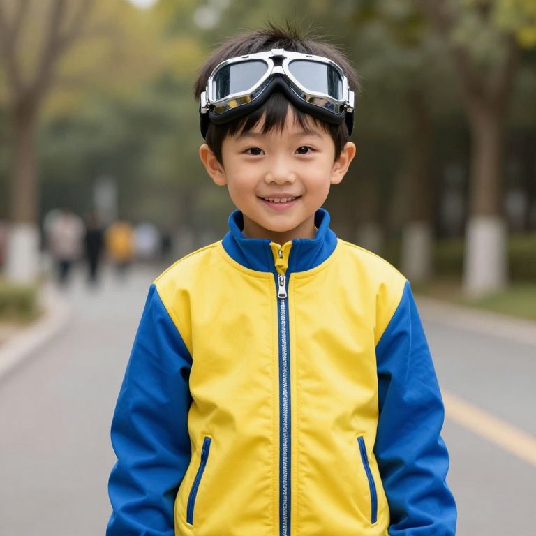 Pac Boy Fancy Dress, boy in yellow and blue jacket with goggles on his head