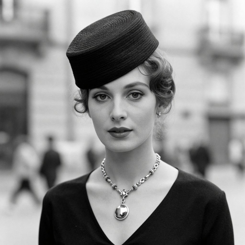 Black-and-white photograph of a stylish woman with fair skin and wavy, dark hair partially covered by a small, textured black beret. She wears a black, V-neck dress and a silver necklace with a circular pendant. Her makeup is subtle with dark lipstick. The blurred background suggests an urban setting with indistinct figures and buildings. The image has a vintage, classic feel, reminiscent of mid-20th century fashion photography. Her expression is calm and slightly serious, with a direct gaze at the camera. The overall composition highlights her elegant, sophisticated appearance.