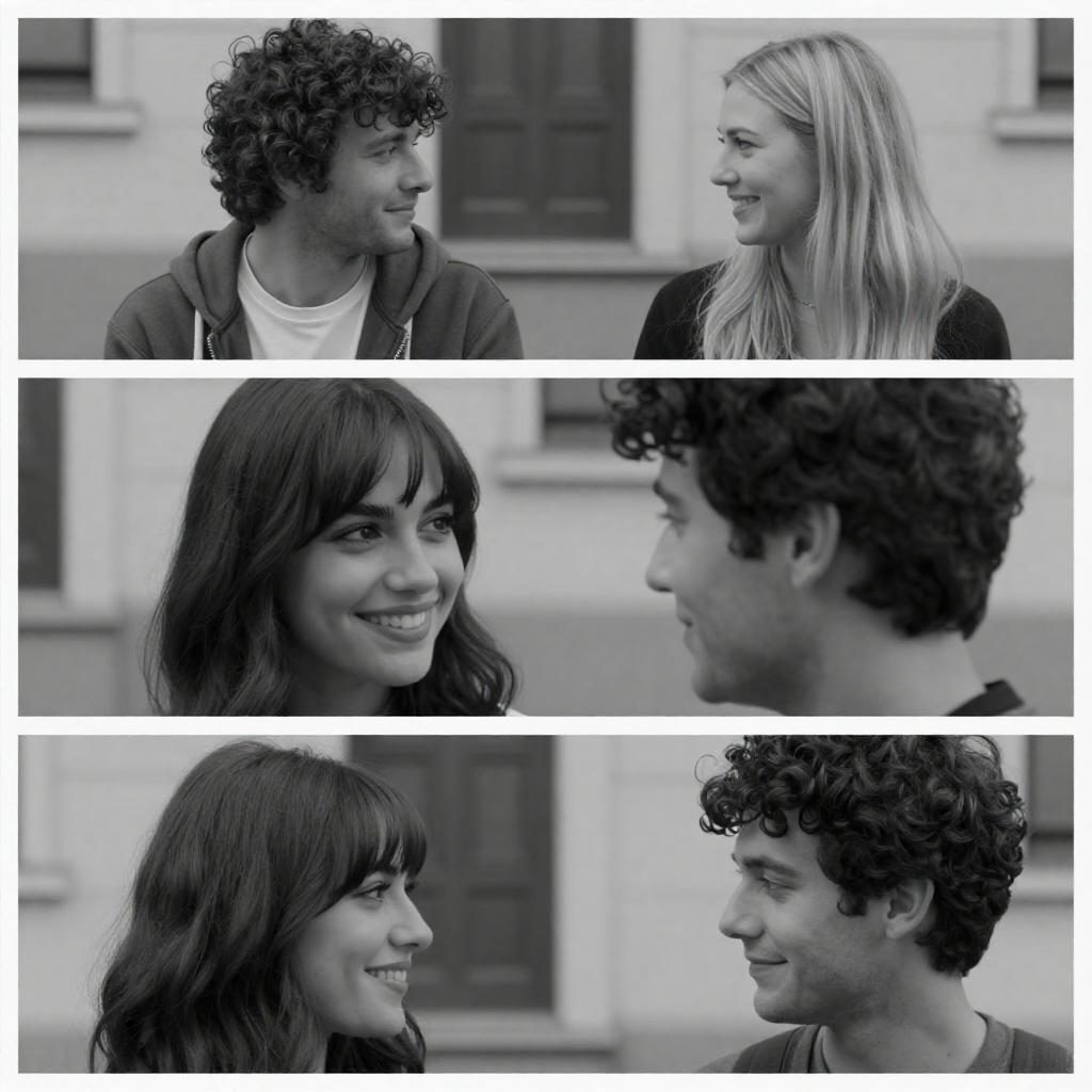 Black-and-white photograph collage of three scenes. Top: curly-haired man in a hoodie and white shirt sits across from a blonde woman with long hair, both smiling. Middle: close-up of a dark-haired woman with bangs smiling at a man with curly hair. Bottom: man with curly hair and another man with dark hair, both looking at the dark-haired woman. Urban background.
