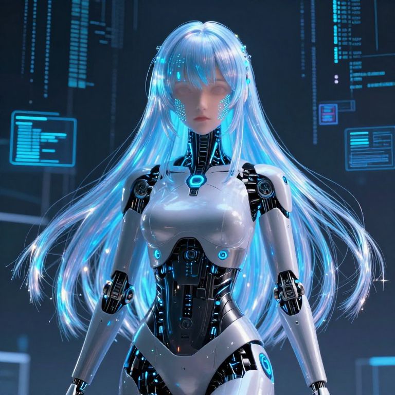 Female anime artificial intelligence depicted as a humanoid robot with smooth metallic skin, intricate blue LED patterns on her face and body, long flowing hair made of fiber optics, set against a digital matrix background with floating code and virtual interfaces.